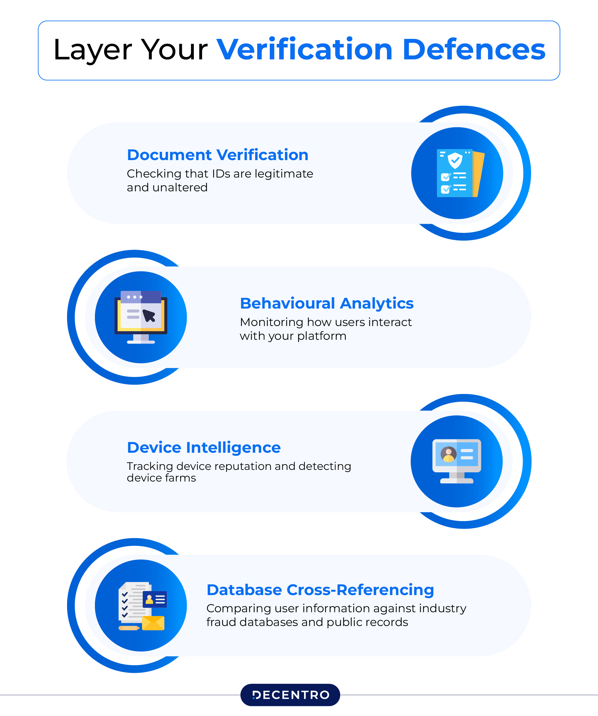 Single-point verification is dead. Modern fraud prevention requires combining document verification (checking that IDs are legitimate and unaltered), behavioural analytics (monitoring how users interact with your platform), device intelligence (tracking device reputation and detecting device farms), and database cross-referencing (comparing user information against industry fraud databases and public records).